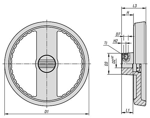 Die Handräder können durch Querverstiftung oder durch eine Zylinderschraube DIN 6912 und eine Vorlegscheibe K0173 axial durch Passfederverbindung auf der Welle befestigt werden.