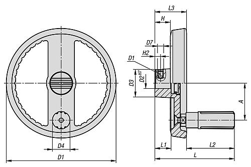 Die Handräder können durch Querverstiftung oder durch eine Zylinderschraube DIN 6912 und einer Vorlegscheibe K0173 axial durch Passfederverbindung auf der Welle befestigt werden.
