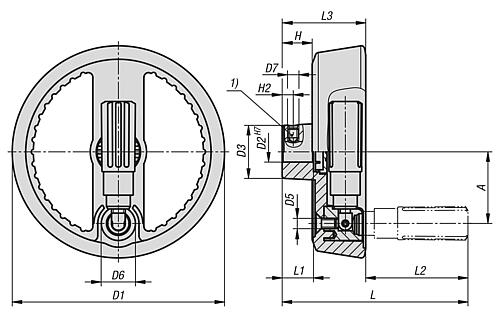 Die Handräder können durch Querverstiftung oder durch eine Zylinderschraube DIN 6912 und eine Vorlegscheibe K0173 axial durch Passfederverbindung auf der Welle befestigt werden.