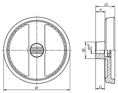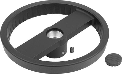 Produktinformationen "2-Speichenhandrad D1=125, Form:E mit Passbohrung, D2=12, Aluminium schwarz pulverbeschichtet, ohne Griff - K1523.125121"
