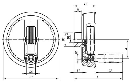 Die Handräder können durch Querverstiftung oder durch eine Zylinderschraube DIN 6912 und eine Vorlegscheibe K0173 axial durch Passfederverbindung auf der Welle befestigt werden.