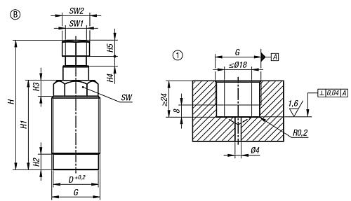 Abstützelement hydraulisch, Form:B einfach wirkend, DK=16, Hub=8, gebohrte Kanäle Stahl - K1854.160823062