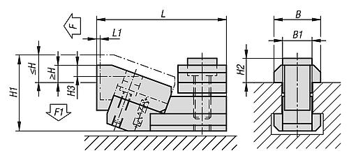 Mit diesen Flachspannern können besonders niedrige Werkstücke gespannt werden. Durch die Keilwirkung der Spannbacken wird das Werkstück fest und sicher auf den Maschinentisch gedrückt. "H1" und "H3" bei maximaler T-Nutentiefe nach DIN 650. Zur Erreichung niedrigerer Spannhöhen bei minimaler Nutentiefe kann das Spannstück um das Maß H3 abgeschliffen werden.