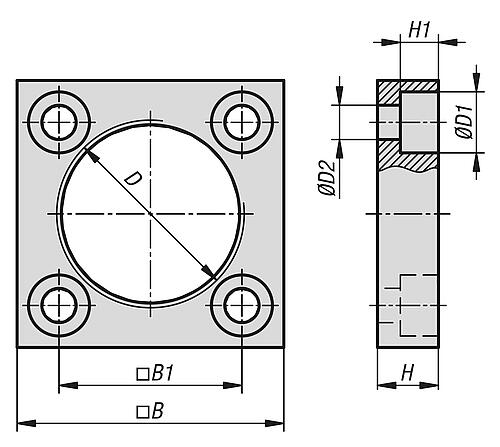 Die Befestigungslöcher im Gewindeflansch haben die gleichen Abmessungen wie die des Schwenkspanners pneumatisch, einschraubbar mit Flansch (K1818) und Hebelspanners pneumatisch, einschraubbar mit Flansch (K1819).