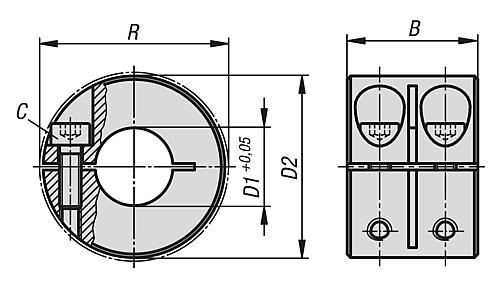 Klemmringe geschlitzt, innen umschließen die Welle mit einer gleichmäßigen Verteilung der Klemmkräfte. Dies führt zu einer maßgenauen Passung und sehr großen Haltekräften ohne die Welle zu beschädigen.
