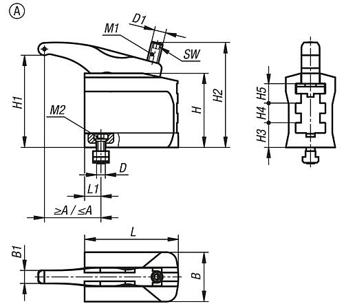 Produktinformationen "Kraftspanner 3-Stufig, lange Ausführung, Form:A mit Spannarm, M12, L=130, B=68, H=101, Vergütungsstahl - K1664.1121301"