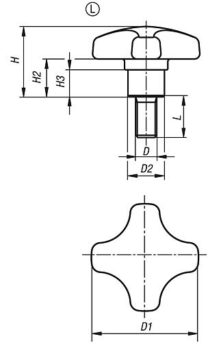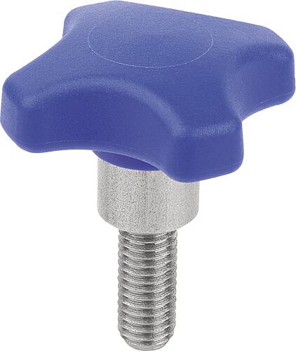 Produktinformationen "Kreuzgriff visuelldetektierbar, mit vorstehender Buchse, Form:L M06X25, D1=32, Polyamid blau RAL5002 - K1794.1332063172X25"