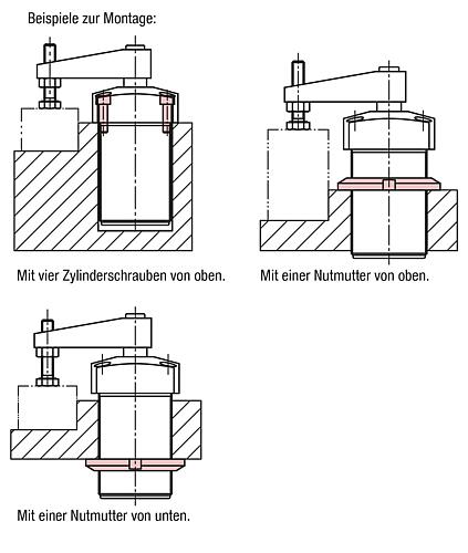Der einschraubbare Schwenkspanner mit Flansch kann mit Hilfe einer Nutmutter nach DIN 70852 von oben oder von unten befestigt werden. Eine weitere Möglichkeit wäre, den Schwenkspanner mit vier Zylinderschrauben von oben an der Vorrichtung zu befestigen.