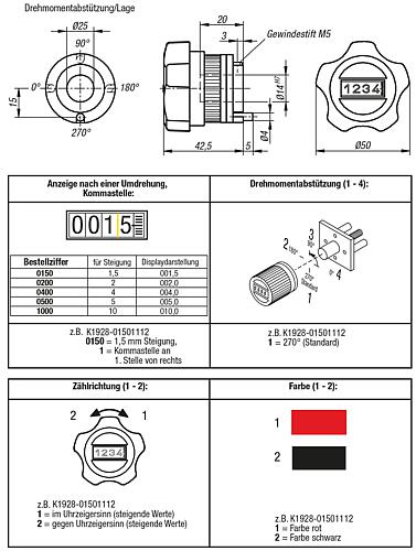Stellknopf mit Positionsanzeiger Kunststoff, rot, Digitalanzeige, Komp:Stahl, P=1,5 - K1928.01501111