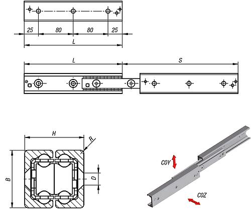 Vollauszug bestehend aus zwei Führungsschienen, die als festes und bewegliches Element dienen und zwei Läufern, die miteinander verbunden das Zwischenelement bilden. Diese Anordnung bietet einen guten Schutz der offenen Kugelkäfige vor Verschmutzung. Der maximale Hub ist größer als die geschlossene Länge der Teleskopschiene. Die Einbaulage sollte bevorzugt horizontal erfolgen. Um alle Befestigungsbohrungen zu erreichen ist es notwendig die Arretierschraube in der Schiene zur Montage zu entfernen und anschließend wieder einzusetzen. Ein beidseitiger Hub wird durch das Entfernen der Arretierschrauben erreicht.